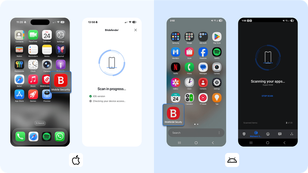 Go to the App Store or Google Play Store> Search “Bitdefender Mobile Security” > Install > Open > Sign in or create an account > Run Quick Scan.