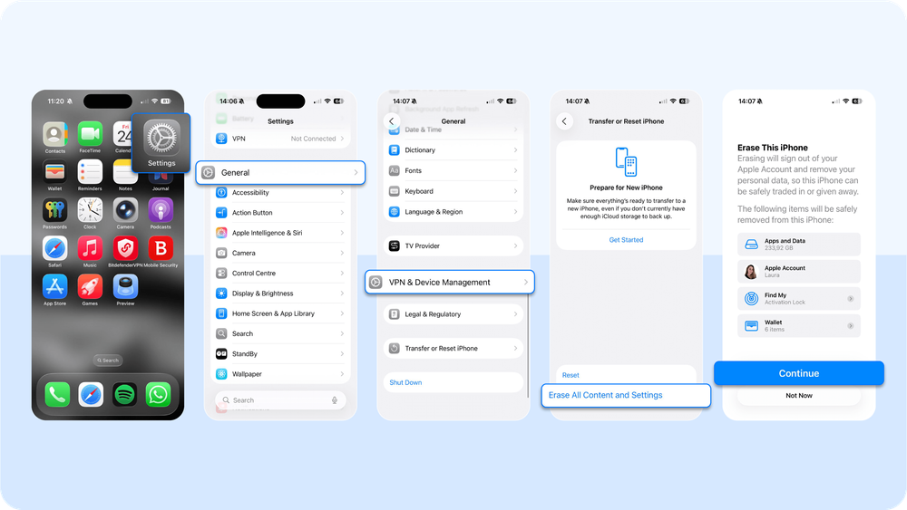 - On iPhone: Go to Settings > General > Transfer or Reset iPhone > Erase All Content and Settings > enter your passcode > confirm Erase iPhone.