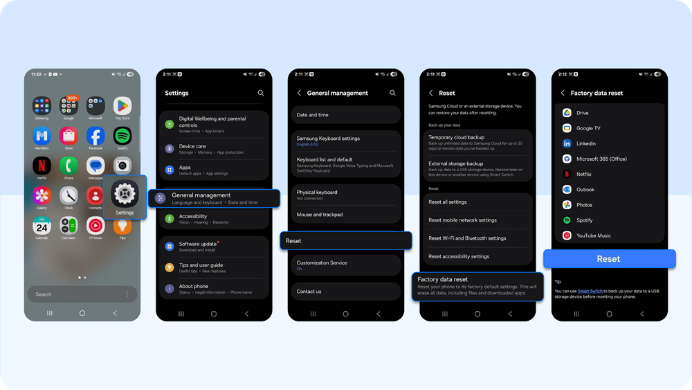 - On Android: Go to Settings > General Management > Reset > Erase all data (factory reset) > confirm with your PIN or password.