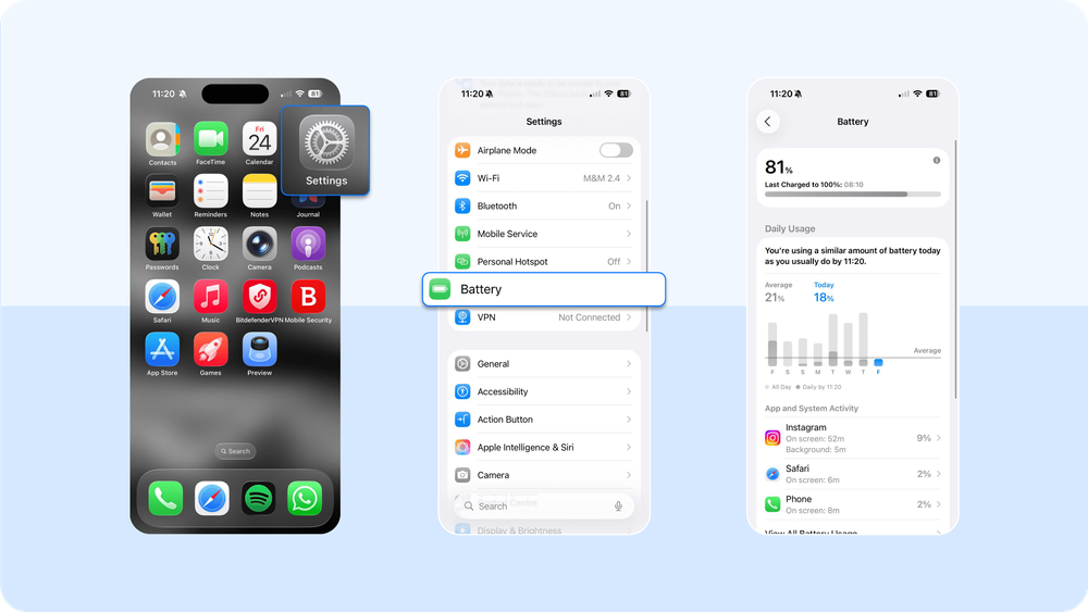 - On iOS devices: Go to Settings > Battery > check the Battery Level graph and Battery Usage by App.