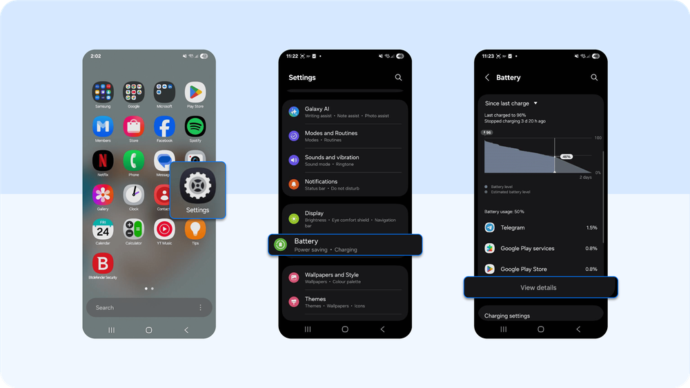 - On Android devices: Open Settings > Battery > Battery usage (or Device Care) > review which apps are using the most power. If you notice any app consuming a lot of power in the background, it could indicate hidden processes like spyware.