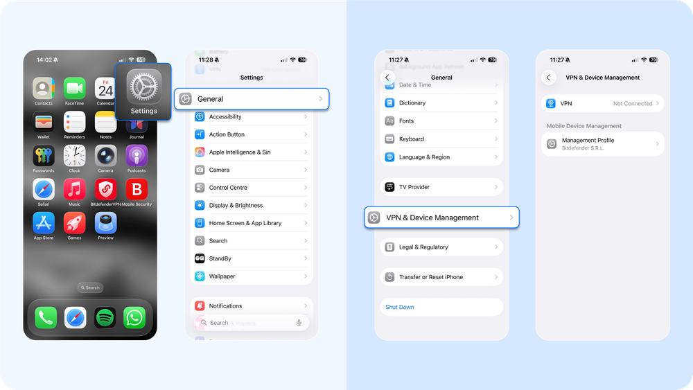 - On iOS devices: If you notice a configuration profile you didn’t install in Settings > General > VPN and Device Management, this could be a red flag.
