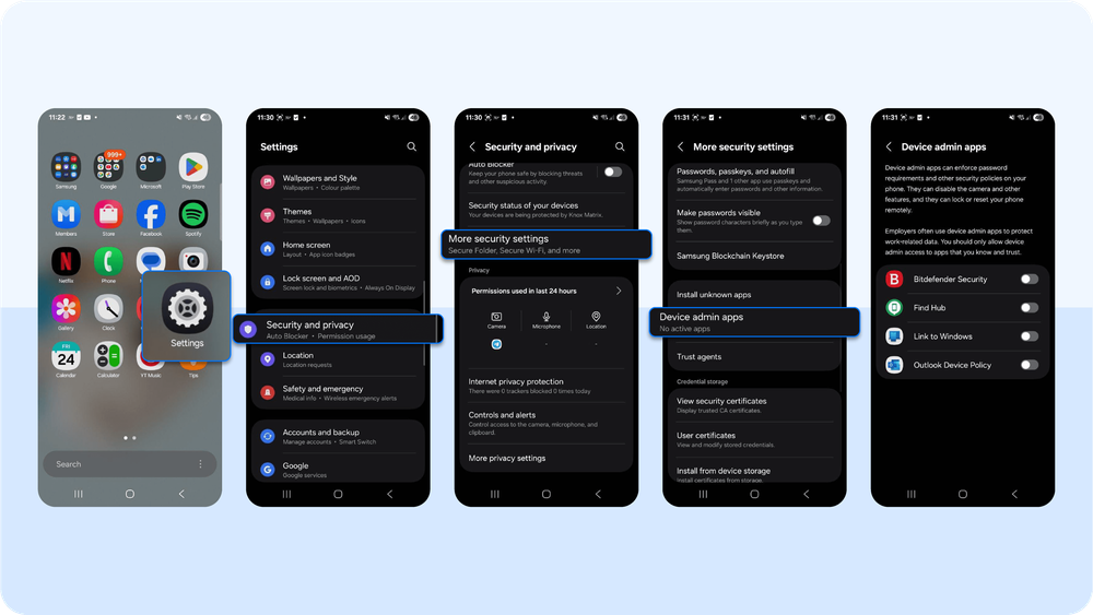 - On Android devices: Check for unknown device admin apps or unfamiliar certificates by going to Settings > Security and Privacy > More Security Settings > Device Admin Apps (or Encryption and Credentials > Trusted Credentials). Disable or remove any apps or certificates that have system-level permissions but aren’t recognized.