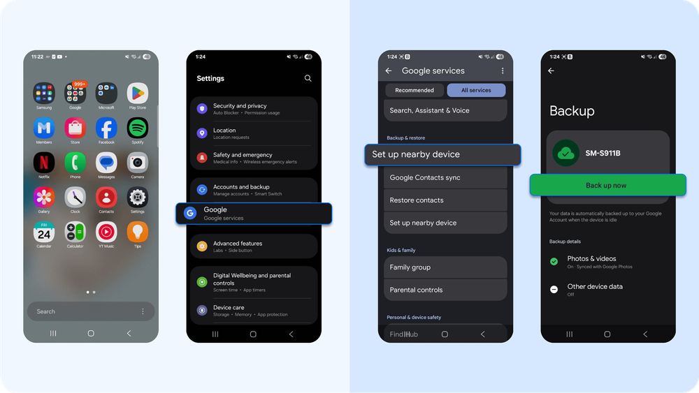- Android devices: Go to Settings > Google > Backup or Settings > System > Backup. Review the listed backups, note unusual timestamps, or devices you don’t recognize. Delete questionable backups from your Google account and reset your Google password and Apple ID.