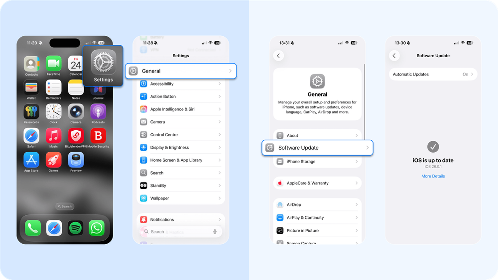 - For iPhone: head to Settings > General > Software Update > Download and Install > If an update is available, tap Download and Install, then follow the prompts. Make sure your phone is plugged in and connected to Wi-Fi.