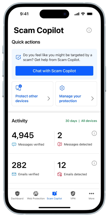 Scam Copilot monitorizează fără întrerupere toate interacțiunile de pe aplicații și dispozitive, inclusiv e-mailuri, mesaje text și rețele sociale. Dacă primești un e-mail sau un mesaj instantaneu suspect, Scam Copilot detectează și te avertizează cu privire la posibile semnale de alarmă, oferindu-ți puterea de a evita să devii încă o victim într-o mare de alte victime.