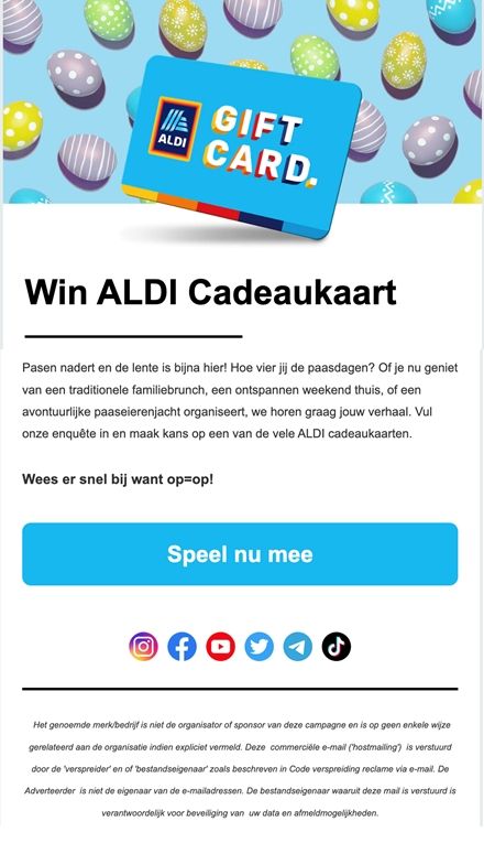 “Easter is approaching and spring is almost here! How do you celebrate Easter? Whether you’re enjoying a traditional family brunch, an adventurous weekend at home, or organizing an adventurous Easter egg hunt, we’d love to hear your story. Complete our survey and have a chance to win one of the many Aldi gift cards.”