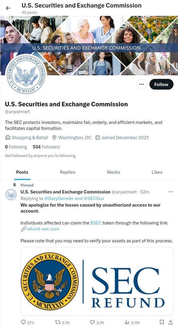 Ever opportunistic, at least one scammer created a fake SEC account on Twitter where they published an apology for the incident, and invited anyone who had lost money as a consequence of the hack to visit a refund site – which was, of course, itself a scam.