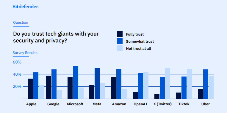Yet in parallel to this growing risk, people’s trust in major tech companies remains surprisingly high – even if flawed. When asked about their trust in Big Tech names, participants named Google (trusted by 88% of respondents), followed by Microsoft (85%), and Apple (77%).