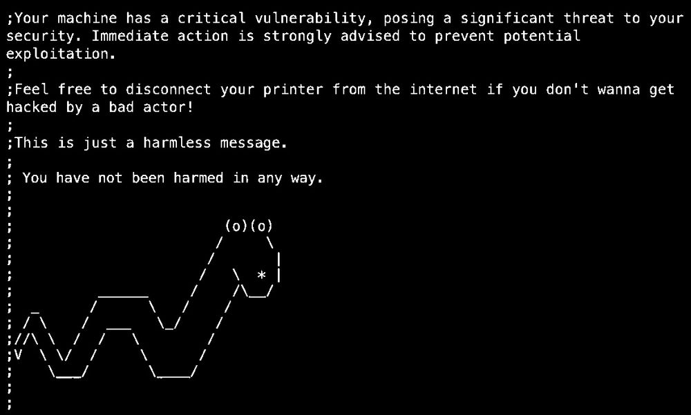 The message contains ASCII art of a worm and claims to be “harmless” – but warns of a “critical vulnerability” in the printer, posing a “significant threat”. It advises affected users to disconnect their printer from the internet to avoid being hacked.