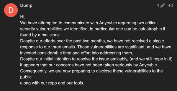 In the message, someone calling themselves “printer god” bemoans Anycubic’s lax security and warns that a malicious attack could have caused damage.