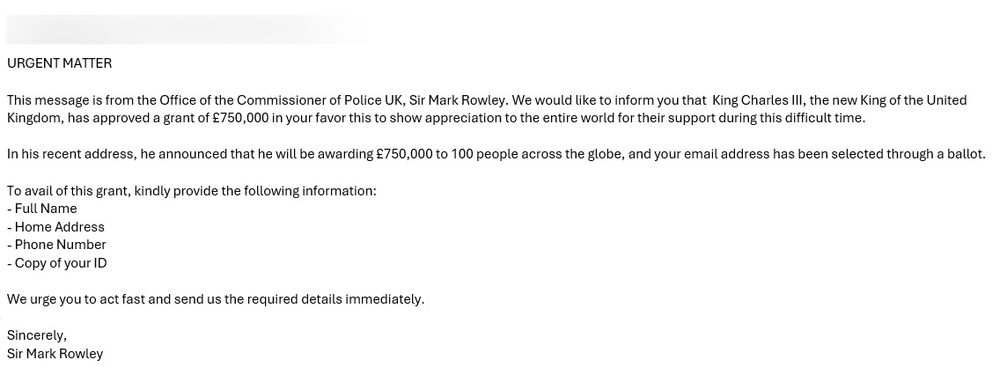 Fraudsters make bold claims in the scam email below, stating that the UK’s monarch, King Charles III, wants to give 750,000 pounds to “100 people across the globe.” You, of course, are one of the lucky winners whose email address was “selected through a ballot.”