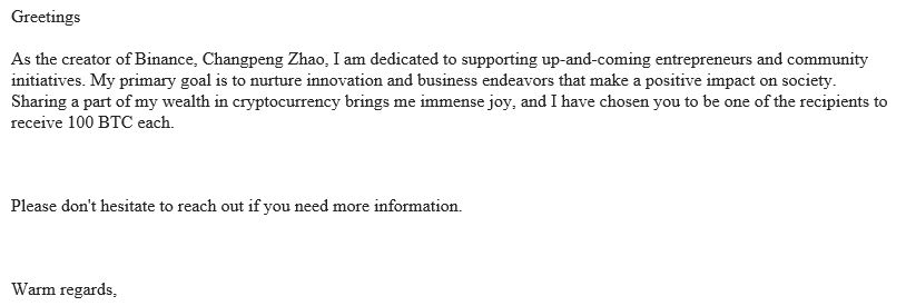 Feeling lucky this week because the founder of the world’s largest cryptocurrency exchange wants to give you 100 BTC? Well, it’s just another scam.