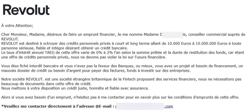 The most recent scam campaign impersonating Revolut targets users in France looking to take out a personal loan with the Fintech company. The cybercriminals pose as financial consultants with the company and offer recipients access to private loans ranging from 10,000 to 10 million Euros. They aim to trick people into giving out their account credentials and other personal details.