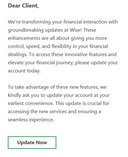 Scammers impersonating money-transfer apps like Wise and Cash App target users with messages that attempt to trick them into verifying or updating accounts to ensure they benefit from the latest safety measures or features. The goal is to access users’ accounts and steal their money.