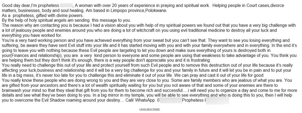 User inboxes were also flooded with phony messages from a gifted prophetess from South Africa. She claims to have over 20 years of experience helping individuals with many issues, including court cases and soul healing. After making very bold claims and describing her vision about you and many others, the prophetess invites recipients to contact or call a WhatsApp number and plan a visit to her temple.