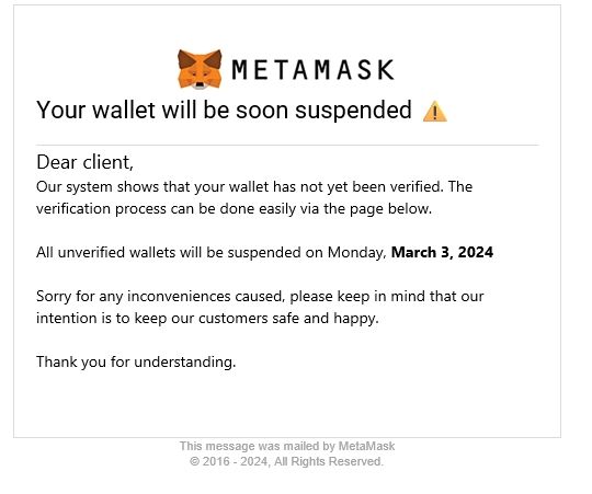 A separate campaign disguised as an urgent email from MetaMask warns recipients their crypto wallet is about to be suspended because it has not been verified, and urges immediate action from the user.