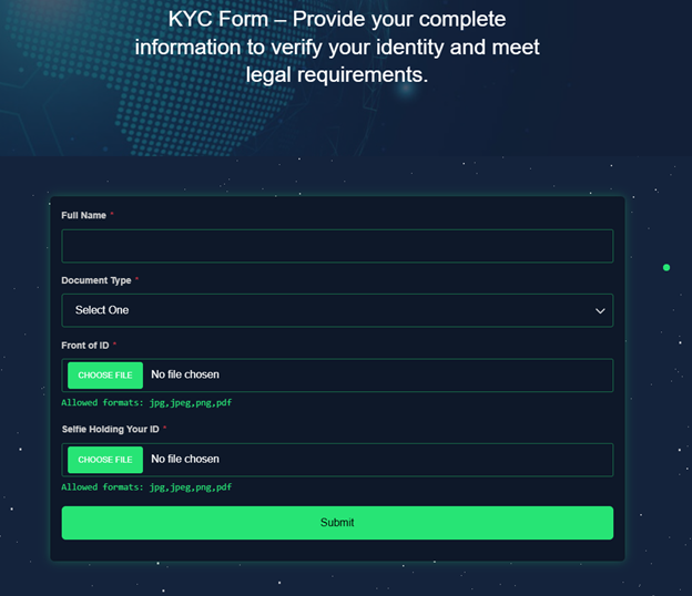 A recent case investigated by Bitdefender illustrates this risk: victims received an email from a fake investment service, XDEX Investments, claiming they had earned over 2.99 BTC in profits from an old “Infinity BTC Plan.” The fraudulent site lured users to log in with temporary credentials, prompting them to complete a KYC (Know Your Customer) form that demanded not only personal details but also a selfie while holding their government-issued ID.
