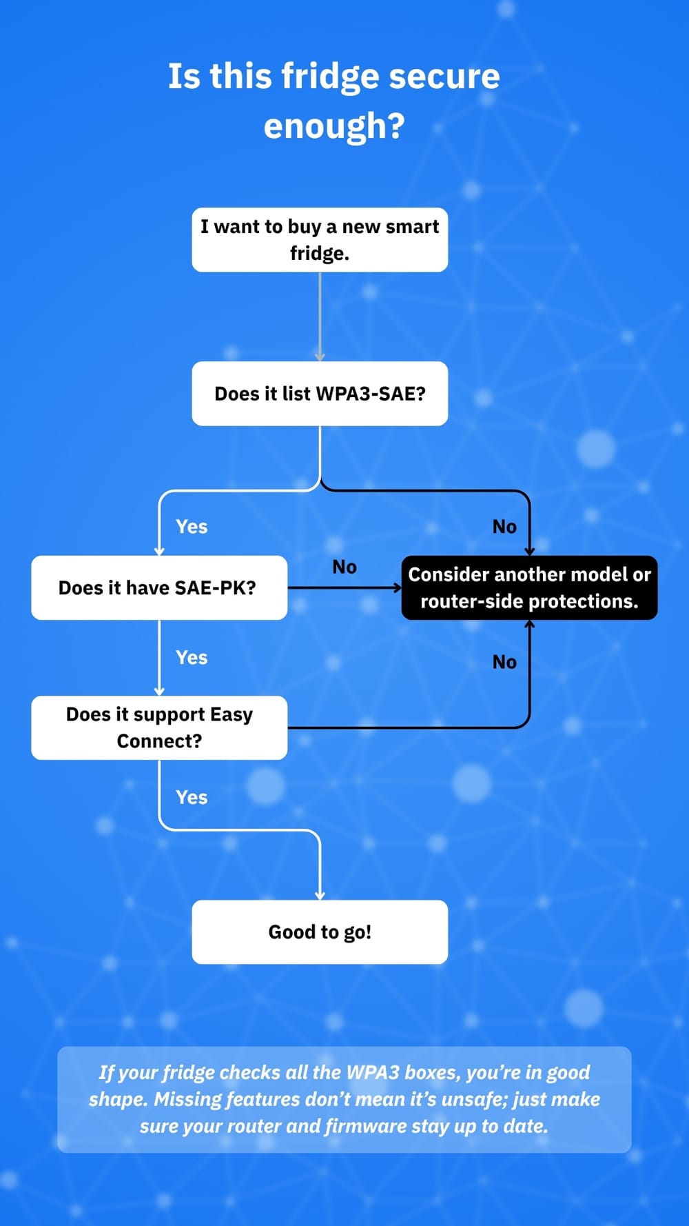 - There’s no official WPA4 yet, so don’t wait for it. Buy a fridge that truly supports WPA3 (with SAE) and, ideally, SAE-PK and Easy Connect.