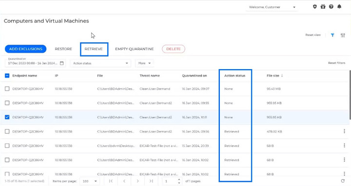 Bitdefender GravityZone Computers and VMs Quarantine management.
