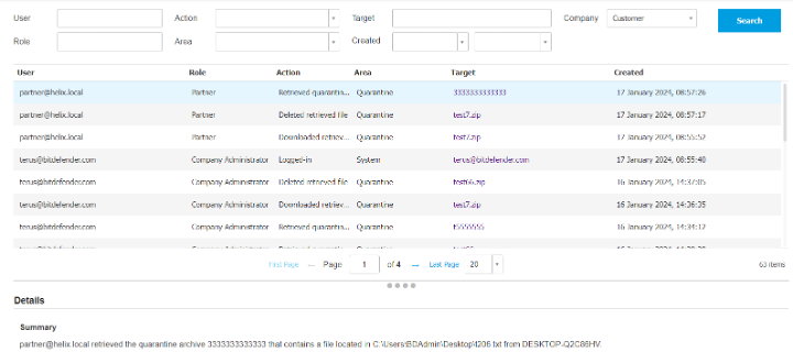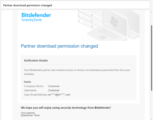 Administrators can decide whether the partner managing their environment can also download files. Permissions can only be added using an account with Company Administrator permission from the child company (customer). All company administrators will receive an email notification each time the partner retrieves the file from quarantine.