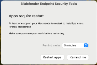 With the latest release, you have more control over when running applications are patched. All applications that are not currently running will be patched automatically. The product now requires restarting applications that are running during patching. End user will receive a pop-up with a list of applications that need to be restarted.