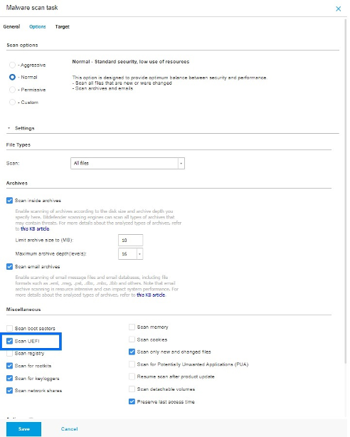 With the latest release, we’ve enhanced the Antimalware module’s capabilities giving you the option to enable UEFI scanning. This feature is available for both on-demand scheduled tasks within Policy configuration and for malware scan tasks initiated from the Network page.