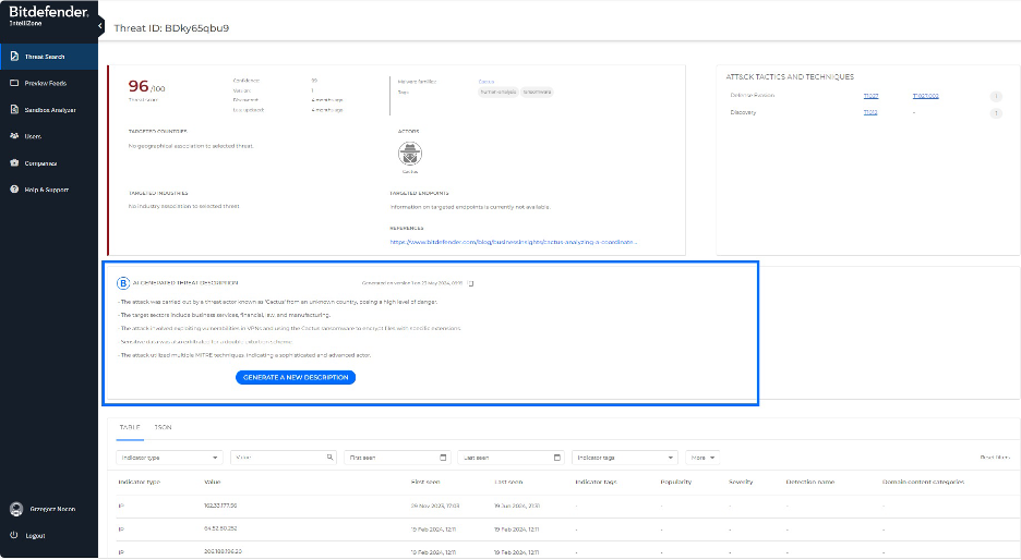 In the latest release, we’ve integrated a Generative AI feature into IntelliZone. This feature is available on the Threat View page and allows you to generate threat descriptions. If you generate a description, the card displays the last generated threat description and the time of its generation.