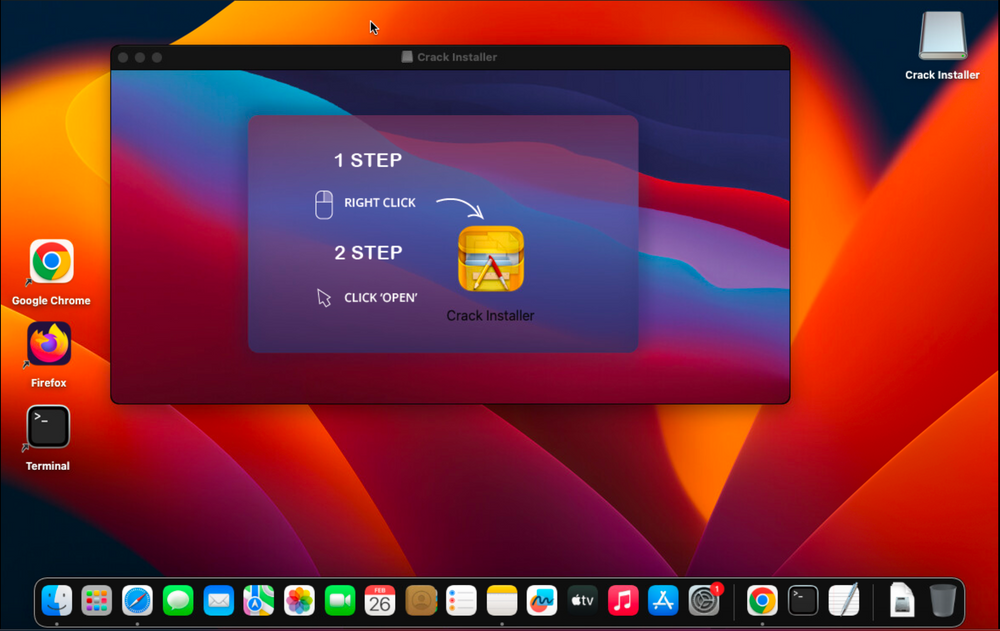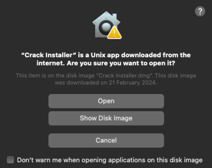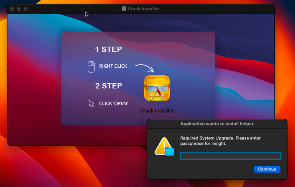 ), that behave like a dropper and are not directly responsible with data theft or the exfiltration of the collected information. When clicking the DMG file, the user is requested to right click, and then open the Crack Installer