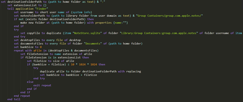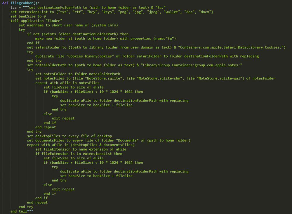 The analysis of the script revealed an interesting and uncommon technique, namelyto combine Python with Apple Scripting, as the filegrabber()