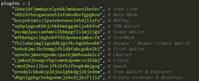 binaries belonging to the Atomic Stealer family also contain embedded IDs corresponding to targeted browser extensions.