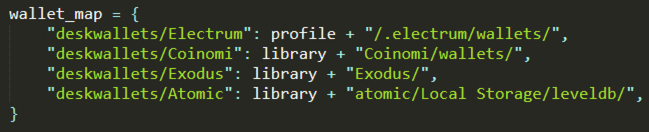 The script also has the ability to collect files belonging to installed crypto wallets, such as Electrum, Coinomi, Exodus or Atomic. This is done by gathering the content of the directories where the applications store their sensitive data on the victim’s computer.