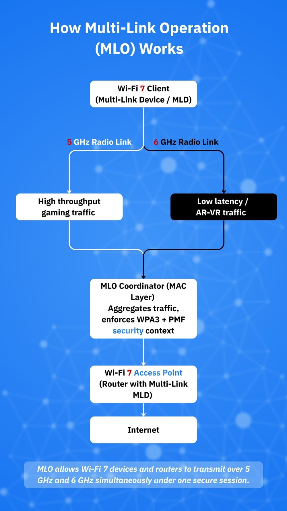 - MLO lets a device talk over multiple bands/links in parallel, balancing or aggregating traffic to slash latency and jitter.