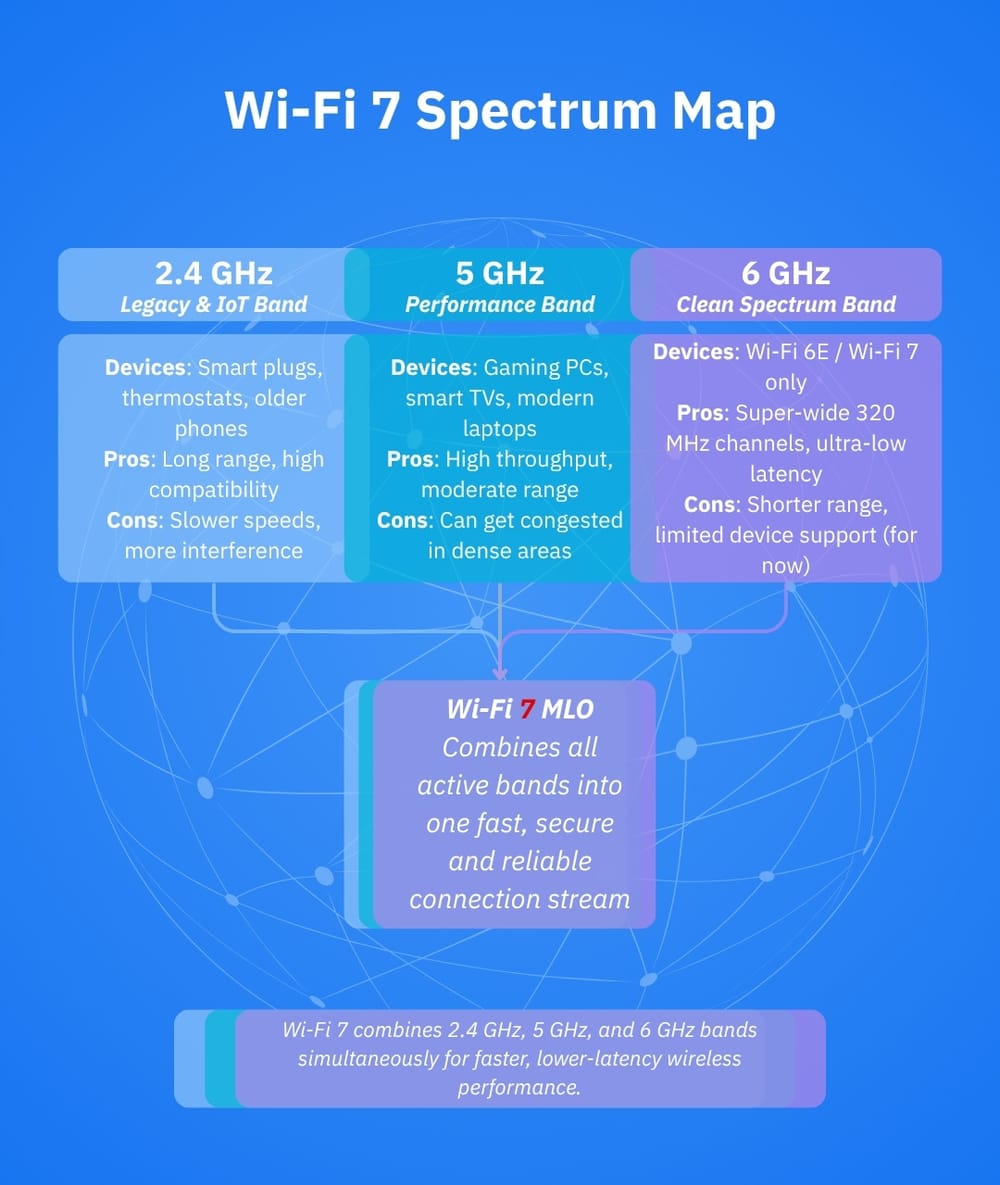 - What it is: Wi-Fi 7 (IEEE 802.11be) brings 320 MHz channels, 4K-QAM and MLO – the ability to use multiple links (2.4/5/6 GHz) at once.